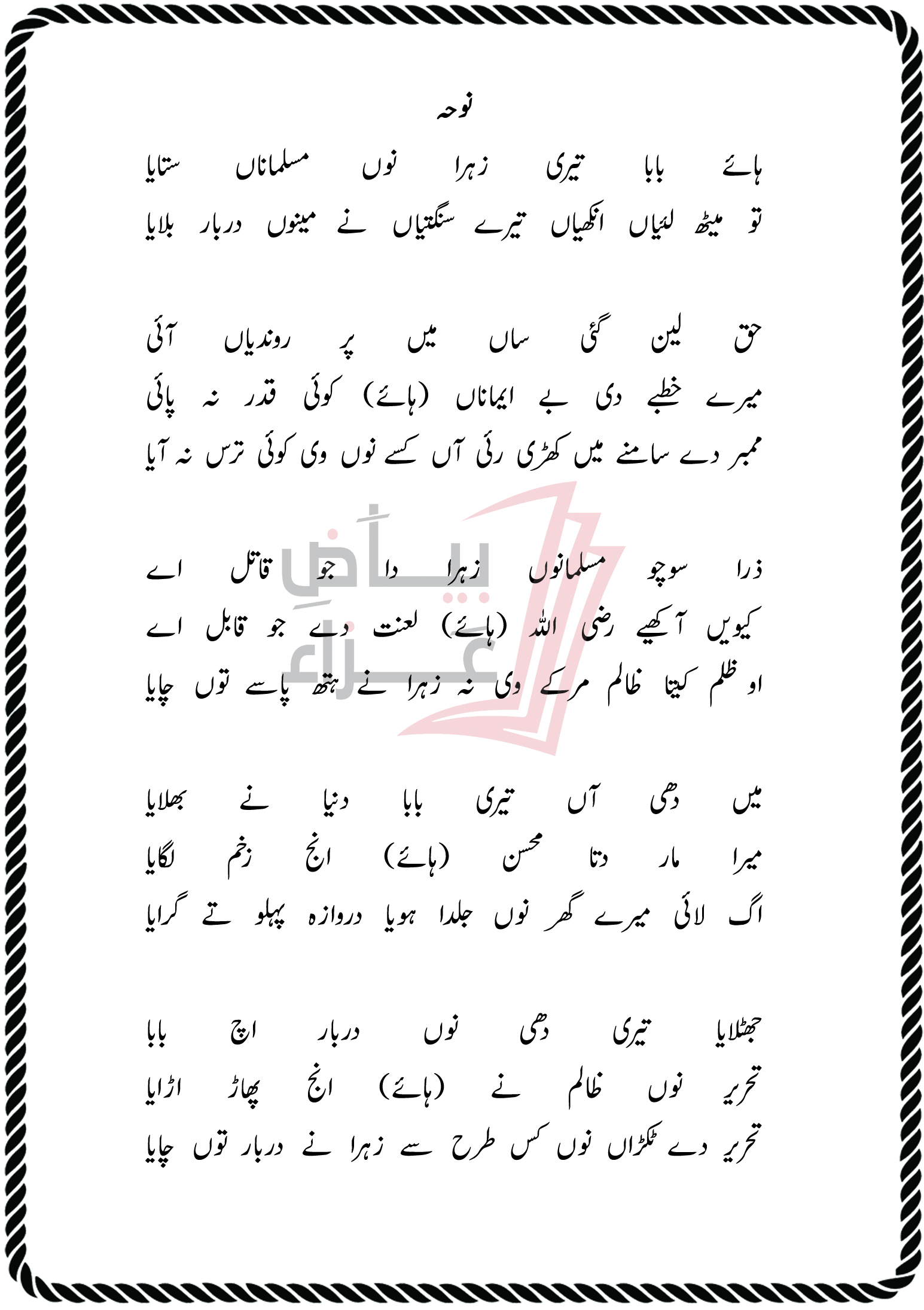 ہائے بابا تیری زہرا نوں مسلماناں ستایا